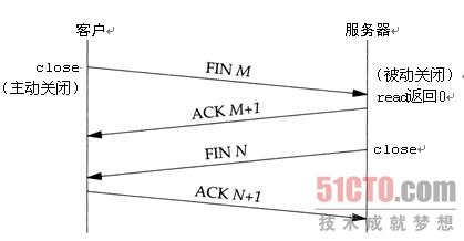第一次挥手:主动关闭方调用close,发送一个FIN给被动方
