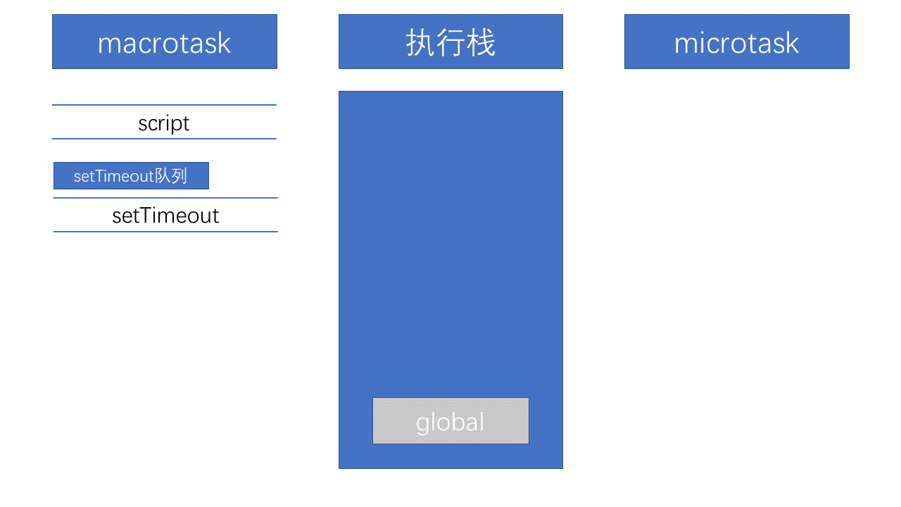 首先,事件循环从宏任务(macrotask)队列开始,这个时候,宏任务队列中,只有一个script(整体代码)任务;当遇到任务源(task source)时,则会先分发任务到对应的任务队列中去。所以,上面例子的第一步执行如下图所示: