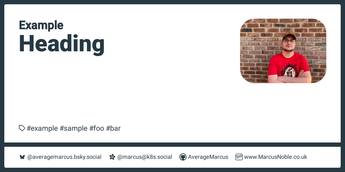 <img src="https://opengraph.cluster.fun/opengraph/?siteTitle=Example&title=Heading&tags=example%2Csample%2Cfoo%2Cbar&image=https%3A%2F%2Fmarcusnoble.co.uk%2Fimages%2Fmarcus.jpg&bluesky=%40averagemarcus.bsky.social&fediverse=%40marcus%40k8s.social&github=AverageMarcus&website=www.MarcusNoble.co.uk&bgColor=%23ffffff&fgColor=%23263943" />