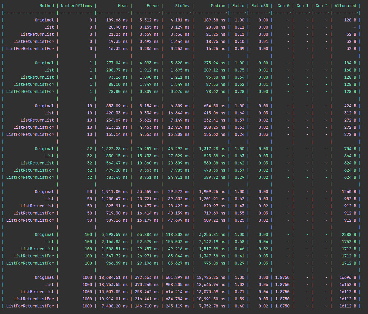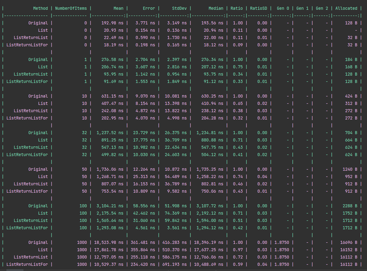 | ListReturnList | 5 | 141.84 ns | 2.861 ns | 5.443 ns | 0.56 | 0.02 | 0.0160 | - | - | 136 B |