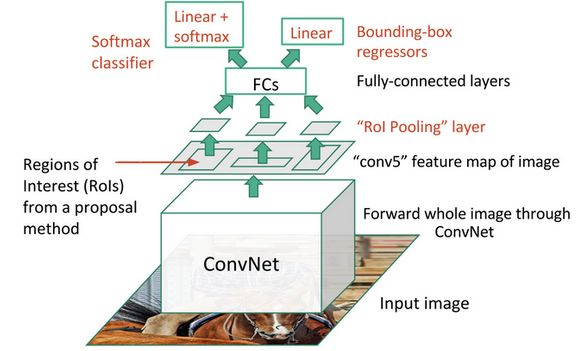- 实现细节:其CNN模型的输入是整张图片,然后结合RoIs(Region of Interests)pooling和Selective Search方法从CNN得到的特征图中提取各个候选区域的所对应的特征。对于每个候选区域,使用RoI pooling层来从CNN特征图中得到一个固定长和宽的特征图(长和宽是超参数,文中选用7* 7),RoI pooling的原理很简单,其根据候选区域按比例从CNN特征图中找到对应的特征区域,然后将其分割成几个子区域(根据要输出的特征图的大小),然后在每个子区域应用max pooling,从而得到固定大小的特征图。