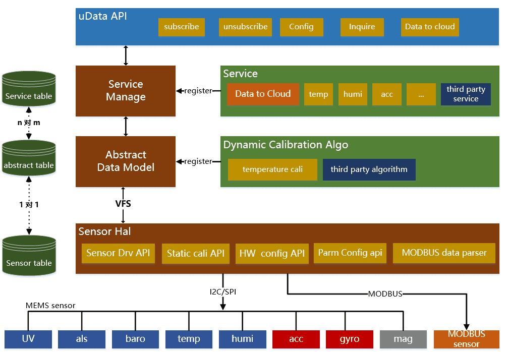 AliOS Things provides a set of sensor uData frameworks that abstract the MODBUS sensor driver nodes through the vfs interface open and read operations.