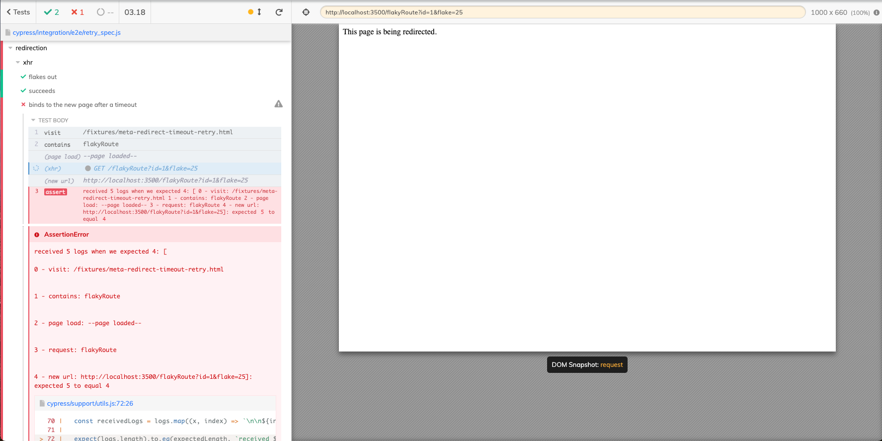 The test fails an xhr call 25 times to queue up the failed pre-request then uses a meta redirect to make the same call which will match to a failed xhr call.