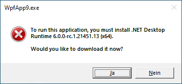 Running a framework dependend, single file published wpf .NET 6.0.100-rc.1.21463.6 on a computer without .NET6 installed silently fails. But there should be a messagebox that runtime is missing. Event viewer says: