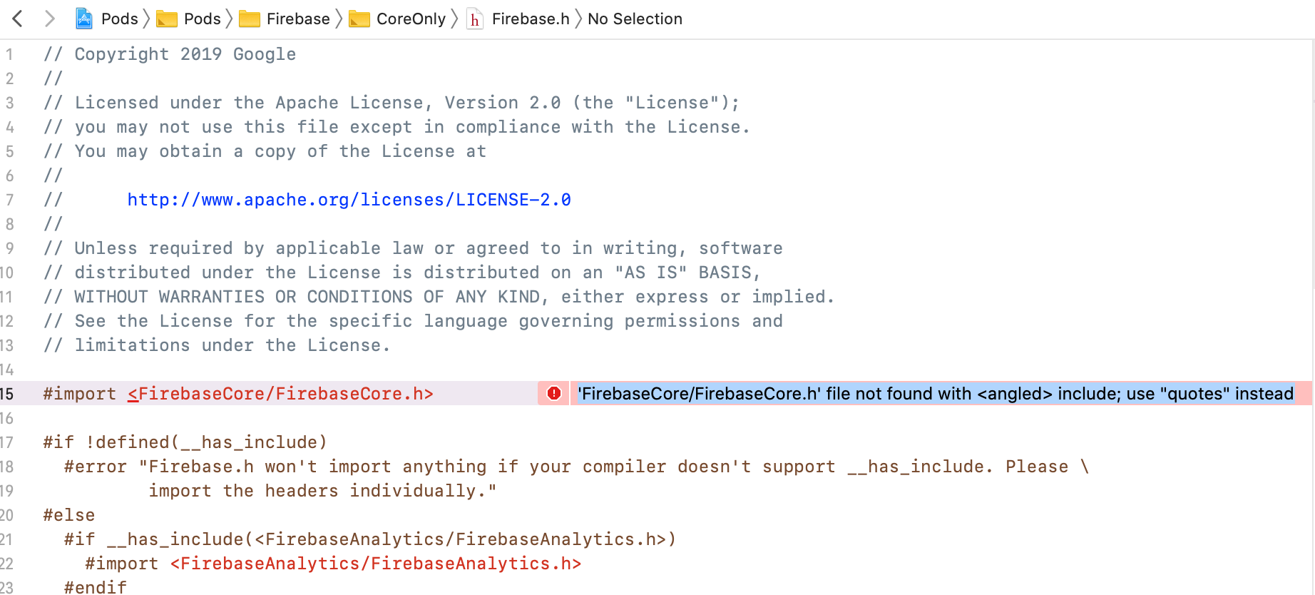<!-- DO NOT DELETE validate_template=true template_path=.github/ISSUE_TEMPLATE/bug_report.md --> ### [REQUIRED] Step 1: Describe your environment * Xcode version: 11.7 or 12.0 (repros on both) * Firebase SDK version: 6.32.2 (`Firebase/Crashlytics (6.32.2)`) * Firebase Component: Core * Component version: 6.10.2 * Installation method: CocoaPods ### [REQUIRED] Step 2: Describe the problem Building my Swift/Objective-C mixed app with the latest version of 'Firebase/Crashlytics' results in the error: ``` 'FirebaseCore/FirebaseCore.h' file not found with <angled> include; use "quotes" instead ``` However, resetting my Podfile to include: ``` pod 'Firebase/Crashlytics', '=6.31.0' ``` fixes the error. I have a hunch that the problem stems from https://github.com/firebase/firebase-ios-sdk/pull/6367 <img width="922" alt="image" src="https://user-images.githubusercontent.com/2254/93408200-d4381380-f848-11ea-95a7-de58572e1763.png"> #### Steps to reproduce: In my case, the problem is reproducible when I upgrade `pod 'Firebase/Crashlytics'` past 6.31.0. #### Relevant Code: See above. If a full sample project is necessary to repro, please let me know and I'll do what I can to provide one.
