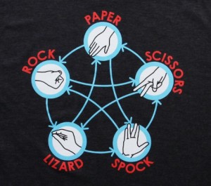 Rock Paper Scissors Lizard Spock was created by Internet Pioneer Sam Kass. All hail Sam Kass! It's very simple, Scissors cuts paper, paper covers rock, rock crushes lizard, lizard poisons Spock, Spock smashes scissors, scissors decapitates lizard, lizard eats paper, paper disproves Spock, Spock vaporizes rock, and as it always has, rock crushes scissors.