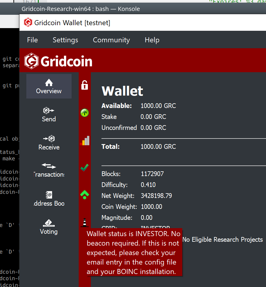 Added - Backport newer uint256 types from Bitcoin #1570 (@cyrossignol) - Implement project level rain for rainbymagnitude #1580 (@jamescowens) - Upgrade utilities (Update checker and snapshot downloader/application) #1576 (@iFoggz) - Provide fees collected in the block by the miner #1601 (@iFoggz) - Add support for generating legacy superblocks from scraper stats #1603 (@cyrossignol) - Port of the Bitcoin Logger to Gridcoin #1600 (@jamescowens) - Implement zapwallettxes #1605 (@jamescowens) - Implements a global event filter to suppress help question mark #1609 (@jamescowens) - Add next target difficulty to RPC output #1615 (@cyrossignol) - Add caching for block hashes to CBlock #1624 (@cyrossignol) - Make toolbars and tray icon red for testnet #1637 (@jamescowens) - Add an rpc call convergencereport #1643 (@jamescowens) - Implement newline filter on config file read in #1645 (@jamescowens) - Implement beacon status icon/button #1646 (@jamescowens) - Add gridcointestnet.png #1649 (@caraka) - Add precision to support magnitudes less than 1 #1651 (@cyrossignol) - Replace research accrual calculations with superblock snapshots #1657 (@cyrossignol) - Publish example gridcoinresearch.conf as a md document to the doc directory #1662 (@jamescowens) - Add options checkbox to disable transaction notifications #1666 (@jamescowens) - Add support for self-service beacon deletion #1695 (@cyrossignol) - Add support for type-specific contract fee amounts #1698 (@cyrossignol) - Add verifiedbeaconreport and pendingbeaconreport #1696 (@jamescowens) - Add preliminary testing option for block v11 height on testnet #1706 (@cyrossignol) - Add verified beacons manifest part to superblock validator #1711 (@cyrossignol) - Implement beacon, vote, and superblock display categories/icons in UI transaction model #1717 (@jamescowens) - neuralnet: Add integrity checking to researcher accrual snapshot registry #1727 (@jamescowens) - Add workaround for scrypt assembly on macOS #1740 (@cyrossignol) - gui: Build onboarding/beacon wizard #1739 (@cyrossignol) - doc: Add CONTRIBUTING.md from bitcoin #1723 (@div72) - rpc: Implement inspectaccrualsnapshot and parseaccrualsnapshotfile #1744 (@jamescowens) - scraper: Add disk based state backing for verified beacon list in scraper #1751 (@jamescowens) - Add ability to recover beacon in block version 11+ #1768 (@cyrossignol) - refactor: Add transaction context to contract handlers #1777 (@cyrossignol) - gui: Add context for when BOINC is attached to a pool #1775 (@cyrossignol) - doc: Clarify what to do if PR in multiple categories (for CONTRIBUTING.md) #1798 (@RoboticMind) - qt: Add option to choose not to start the wallet minimized #1804 (@jamescowens) - superblock: Add check for OutOfSyncByAge to SuperblockValidator::Validate #1806 (@jamescowens) - contract: Standardize contract validation and add block context #1808 (@cyrossignol) - add seed.gridcoin.pl to default config #1812 (@wilkart) - gui: Implement sidestake send display #1813 (@jamescowens) - gui: Add pool/investor pages to researcher wizard #1819 (@cyrossignol) - ci: Port lint scripts from Bitcoin #1823 (@div72) - doc: Create basic readme in contrib #1826 (@RoboticMind) - gui: Implement TransactionRecord::Message #1829 (@jamescowens) - rpc: Add private_key_available to beaconstatus #1833 (@a123b) - gui: Validate email address in researcher wizard #1840 (@a123b) - rpc: Add "getrawwallettransaction" RPC function #1842 (@cyrossignol) - consensus: Set block version 11 threshold height for mainnet #1862 (@cyrossignol) Changed - Upgrade LevelDB from v1.17 to v1.20 #1562 (@cyrossignol) - Re-enable scrypt optimizations #1450 (@denravonska) - Derive CScript from prevector type (optimization) #1554 (@cyrossignol) - Disable quorum for grandfathered blocks to speed up sync #1568 (@cyrossignol) - Refactor hashBoinc for binary claim contexts #1558 (@cyrossignol) - integrated_scraper_2 branch tracking PR #1559 (@jamescowens) - Upgrade depends - OpenSSL to 1.1.1d #1581 (@jamescowens) - Ubuntu 19.10 fixes #1590 (@denravonska) - Force a re-parse of legacy claims in generated blocks #1592 (@cyrossignol) - Improve the "versionreport" RPC output #1595 (@cyrossignol) - Overhaul the core tally and accrual system #1583 (@cyrossignol) - Overhaul the superblock quorum system #1597 (@cyrossignol) - Add more data to the "superblocks" RPC output #1599 (@cyrossignol) - Update Windows Build doc #1606 (@barton2526) - Change the order of calls in gridcoinresearchd.cpp to optimize rpc shunt path #1610 (@jamescowens) - Change staking tooltip to display frequency #1611 (@jamescowens) - Enhancements to ETTS #1442 (@jamescowens) - Standardize money values as integers #1614 (@cyrossignol) - Clean up and optimize legacy coin age code #1616 (@cyrossignol) - Some scraper cleanups #1620 (@jamescowens) - Reorganize accrual code and fix 6-month cutoff #1630 (@cyrossignol) - Update Copyright years #1633 (@barton2526) - Change team whitelist delimiter to <> for CPID detection #1634 (@cyrossignol) - Change team whitelist separator to <> to accomodate more team names #1632 (@jamescowens) - Change Curl download speed type to support older environments #1640 (@cyrossignol) - Optimize logo SVGs used for tray icons #1638 (@cyrossignol) - Tweak consolidateunspent rpc function #1644 (@jamescowens) - ETTS and staking icon enhancements #1650 (@jamescowens) - Implement new transaction fees for block version 11 #1652 (@jamescowens) - Optimize in-memory storage of superblock data #1653 (@cyrossignol) - Miscellaneous superblock API improvements and housekeeping #1654 (@cyrossignol) - Update openssl to 1.1.1f compatibility #1660 (@jamescowens) - Optimize bdb to avoid synchronous flush of database #1659 (@jamescowens) - Add support for CPID input to "lifetime" RPC function #1668 (@cyrossignol) - Overhaul the contract handling system #1669 (@cyrossignol) - Make the autostart mainnet/testnet aware #1671 (@jamescowens) - Remove slashes from User Agent in peers tab #1674 (@div72) - Re