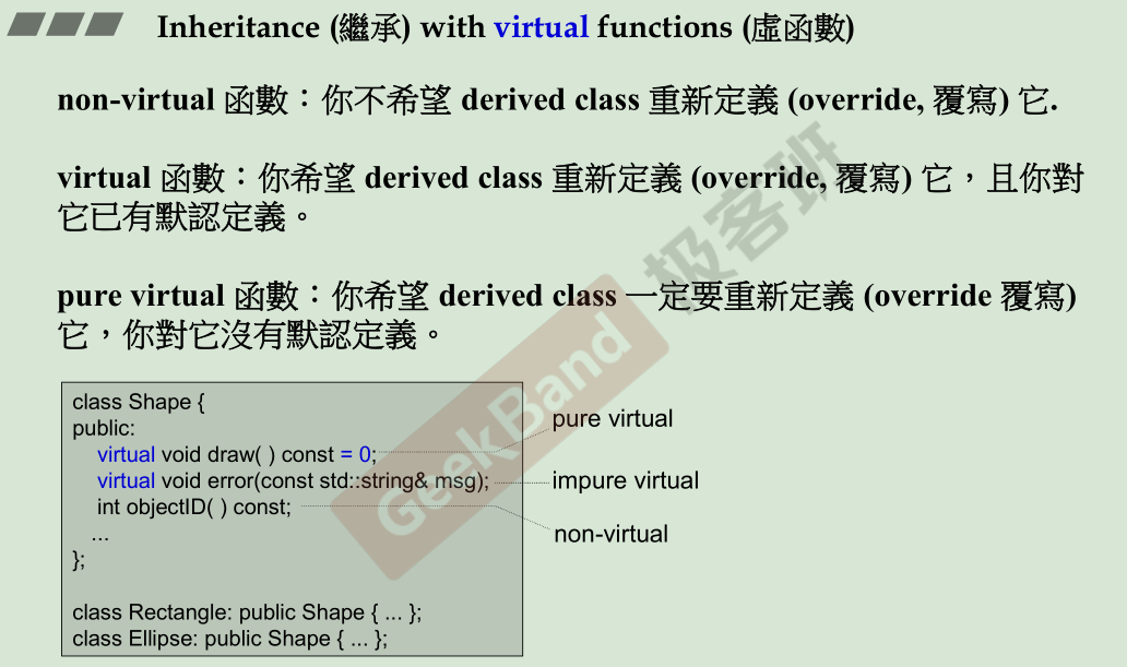 如上图所示,定义了三个类,A、B和C,B继承于A,C继承于B,A中有两个虚函数,B中有一个,C中也有一个。编译器将A的对象a在内存中分配如上图所示,只有两个成员变量m_data1和m_data2,与此同时,由于A类有虚函数,编译器将给a对象分配一个空间用于保存虚函数表,这张表维护着该类的虚函数地址(动态绑定),由于A类有两个虚函数,于是a的虚函数表中有两个空间(黄蓝空间)分别指向A::vfunc1()和A::vfunc2();同样的,b是B类的一个对象,由于B类重写了A类的vfunc1()函数,所以B的虚函数表(青色部分)将指向B::vfunc1(),同时B继承了A类的vfunc2(),所以B的虚函数表(蓝色部分)将指向父类A的A::vfunc2()函数;同样的,c是C类的一个对象,由于C类重写了父类的vfunc1()函数,所以C的虚函数表(黄色部分)将指向C::vfunc1(),同时C继承了超类A的vfunc2(),所以B的虚函数表(蓝色部分)将指向A::vfunc2()函数。同时上图也用C语言代码说明了编译器底层是如何调用这些函数的,这便是面向对象继承多态的本质。