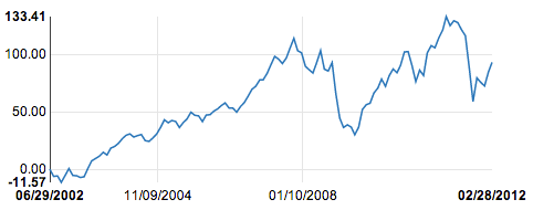 "values": [ [ 1025409600000 , 0] , [ 1028088000000 , -6.3382185140371] , [ 1030766400000 , -5.9507873460847] , [ 1033358400000 , -11.569146943813] , [ 1036040400000 , -5.4767332317425] , [ 1038632400000 , 0.50794682203014] , [ 1041310800000 , -5.5310285460542] , [ 1043989200000 , -5.7838296963382] , [ 1046408400000 , -7.3249341615649] , [ 1049086800000 , -6.7078630712489] , [ 1051675200000 , 0.44227126150934] , [ 1054353600000 , 7.2481659343222] , [ 1056945600000 , 9.2512381306992] , [ 1059624000000 , 11.341210982529] , [ 1062302400000 , 14.734820409020] , [ 1064894400000 , 12.387148007542] , [ 1067576400000 , 18.436471461827] , [ 1070168400000 , 19.830742266977] , [ 1072846800000 , 22.643205829887] , [ 1075525200000 , 26.743156781239] , [ 1078030800000 , 29.597478802228] , [ 1080709200000 , 30.831697585341] , [ 1083297600000 , 28.054068024708] , [ 1085976000000 , 29.294079423832] , [ 1088568000000 , 30.269264061274] , [ 1091246400000 , 24.934526898906] , [ 1093924800000 , 24.265982759406] , [ 1096516800000 , 27.217794897473] , [ 1099195200000 , 30.802601992077] , [ 1101790800000 , 36.331003758254] , [ 1104469200000 , 43.142498700060] , [ 1107147600000 , 40.558263931958] , [ 1109566800000 , 42.543622385800] , [ 1112245200000 , 41.683584710331] , [ 1114833600000 , 36.375367302328] , [ 1117512000000 , 40.719688980730] , [ 1120104000000 , 43.897963036919] , [ 1122782400000 , 49.797033975368] , [ 1125460800000 , 47.085993935989] , [ 1128052800000 , 46.601972859745] , [ 1130734800000 , 41.567784572762] , [ 1133326800000 , 47.296923737245] , [ 1136005200000 , 47.642969612080] , [ 1138683600000 , 50.781515820954] , [ 1141102800000 , 52.600229204305] , [ 1143781200000 , 55.599684490628] , [ 1146369600000 , 57.920388436633] , [ 1149048000000 , 53.503593218971] , [ 1151640000000 , 53.522973979964] , [ 1154318400000 , 49.846822298548] , [ 1156996800000 , 54.721341614650] , [ 1159588800000 , 58.186236223191] , [ 1162270800000 , 63.908065540997] , [ 1164862800000 , 69.767285129367] , [ 1167541200000 , 72.534013373592] , [ 1170219600000 , 77.991819436573] , [ 1172638800000 , 78.143584404990] , [ 1175313600000 , 83.702398665233] , [ 1177905600000 , 91.140859312418] , [ 1180584000000 , 98.590960607028] , [ 1183176000000 , 96.245634754228] , [ 1185854400000 , 92.326364432615] , [ 1188532800000 , 97.068765332230] , [ 1191124800000 , 105.81025556260] , [ 1193803200000 , 114.38348777791] , [ 1196398800000 , 103.59604949810] , [ 1199077200000 , 101.72488429307] , [ 1201755600000 , 89.840147735028] , [ 1204261200000 , 86.963597532664] , [ 1206936000000 , 84.075505208491] , [ 1209528000000 , 93.170105645831] , [ 1212206400000 , 103.62838083121] , [ 1214798400000 , 87.458241365091] , [ 1217476800000 , 85.808374141319] , [ 1220155200000 , 93.158054469193] , [ 1222747200000 , 65.973252382360] , [ 1225425600000 , 44.580686638224] , [ 1228021200000 , 36.418977140128] , [ 1230699600000 , 38.727678144761] , [ 1233378000000 , 36.692674173387] , [ 1235797200000 , 30.033022809480] , [ 1238472000000 , 36.707532162718] , [ 1241064000000 , 52.191457688389] , [ 1243742400000 , 56.357883979735] , [ 1246334400000 , 57.629002180305] , [ 1249012800000 , 66.650985790166] , [ 1251691200000 , 70.839243432186] , [ 1254283200000 , 78.731998491499] , [ 1256961600000 , 72.375528540349] , [ 1259557200000 , 81.738387881630] , [ 1262235600000 , 87.539792394232] , [ 1264914000000 , 84.320762662273] , [ 1267333200000 , 90.621278391889] , [ 1270008000000 , 102.47144881651] , [ 1272600000000 , 102.79320353429] , [ 1275278400000 , 90.529736050479] , [ 1277870400000 , 76.580859994531] , [ 1280548800000 , 86.548979376972] , [ 1283227200000 , 81.879653334089] , [ 1285819200000 , 101.72550015956] , [ 1288497600000 , 107.97964852260] , [ 1291093200000 , 106.16240630785] , [ 1293771600000 , 114.84268599533] , [ 1296450000000 , 121.60793322282] , [ 1298869200000 , 133.41437346605] , [ 1301544000000 , 125.46646042904] , [ 1304136000000 , 129.76784954301] , [ 1306814400000 , 128.15798861044] , [ 1309406400000 , 121.92388706072] , [ 1312084800000 , 116.70036100870] , [ 1314763200000 , 88.367701837033] , [ 1317355200000 , 59.159665765725] , [ 1320033600000 , 79.793568139753] , [ 1322629200000 , 75.903834028417] , [ 1325307600000 , 72.704218209157] , [ 1327986000000 , 84.936990804097] , [ 1330491600000 , 93.388148670744]]