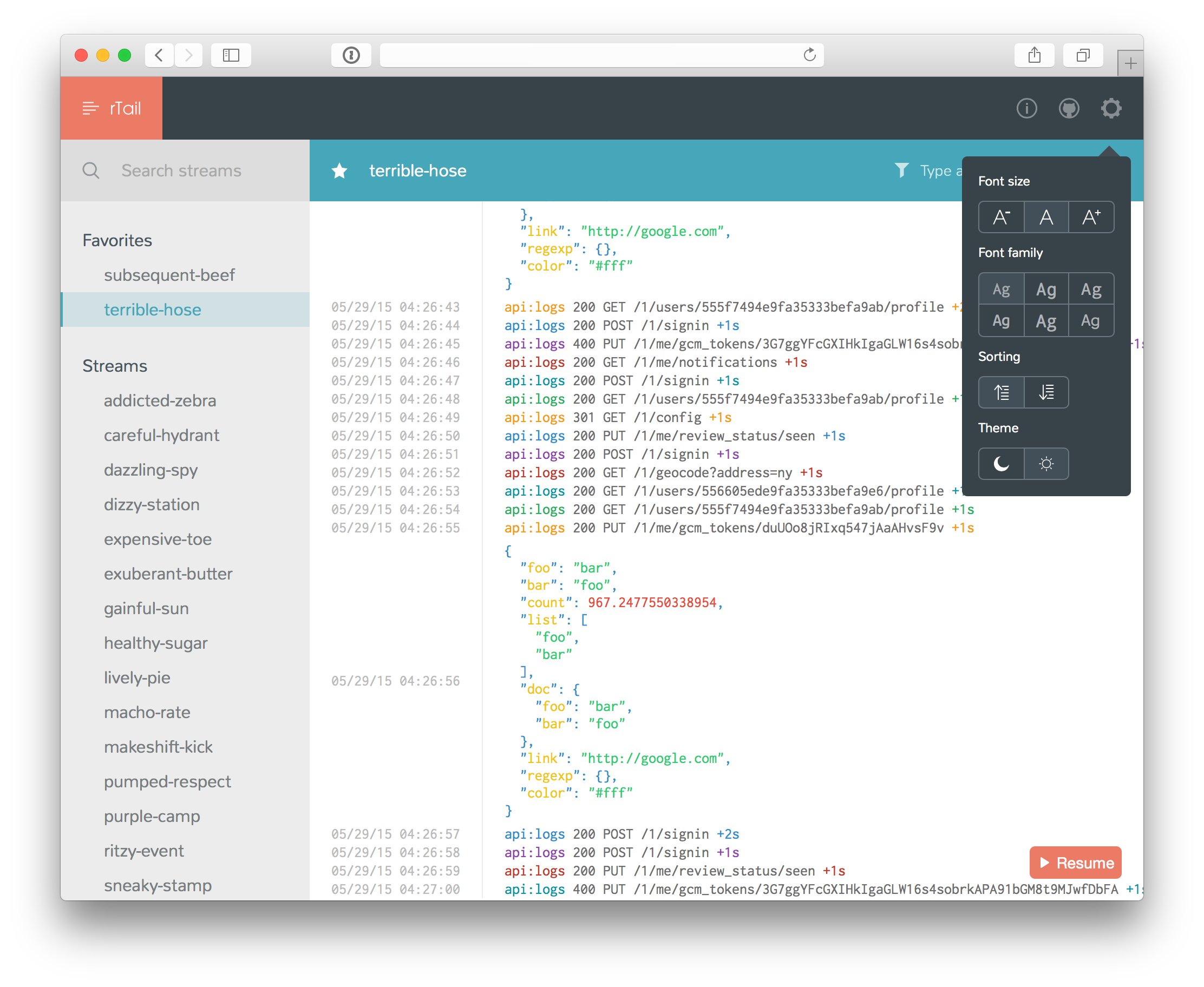 client, displaying all incoming log streams in a realtime web view. Under the hood, the server uses socket.io to pipe every incoming UDP message to the browser.