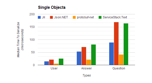 For comparison, here's how Jil stacks up against other popular .NET serializers in a synthetic benchmark: