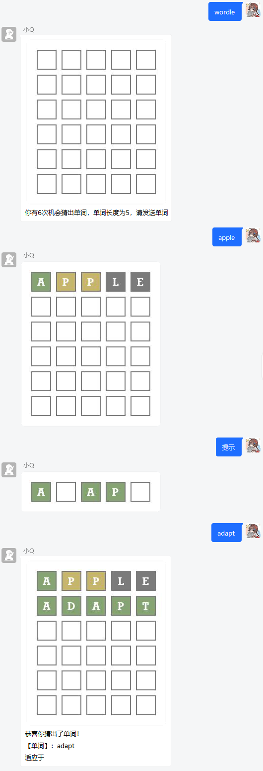 可发送“结束”结束游戏;可发送“提示”查看提示。