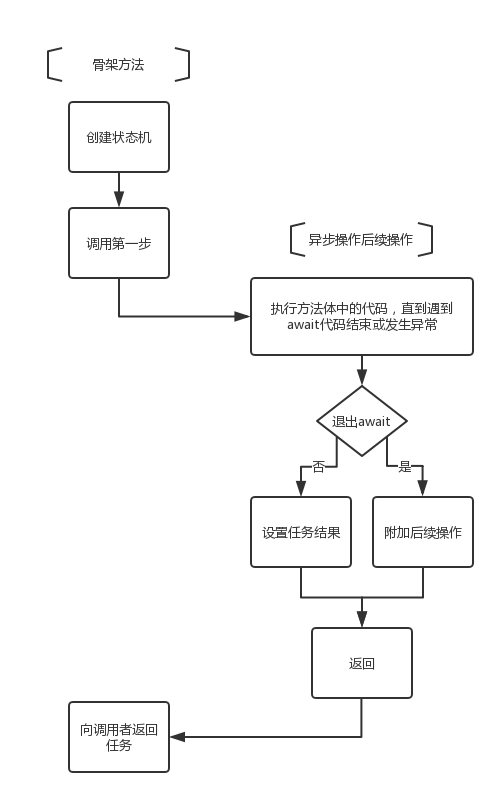 - __moveNext - 恢复委托函数,对应状态机中的 MoveNext 方法,该委托函数会在执行过程中作为回调函数返回给对应Task的 Awaiter 从而使得 MoveNext 持续执行