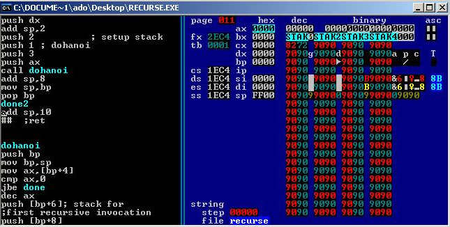 上面的代码表示,取出 Stack 最近写入的值(即 EBX 寄存器的原始值),再将这个值写回 EBX 寄存器(因为加法已经做完了,EBX 寄存器用不到了)。