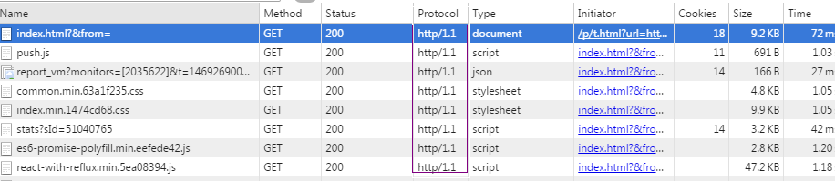 服务端推送(server push),同SPDY一样,HTTP2.0也具有server push功能。目前,有大多数网站已经启用HTTP2.0,例如YouTuBe,淘宝网等网站,利用chrome控制台可以查看是否启用H2: