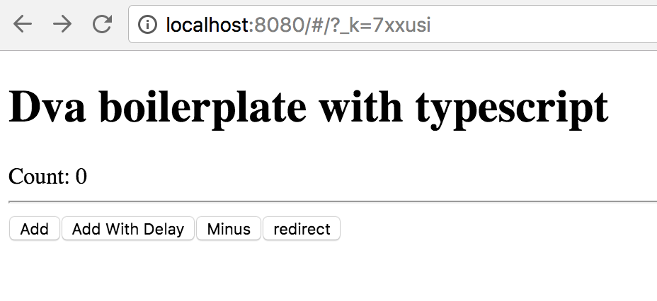 dva boilerplate for typescript Get Started $ npm i $ npm start Open http://localhost:8080 in you browser. If success, you'll see page as below.