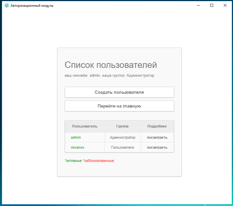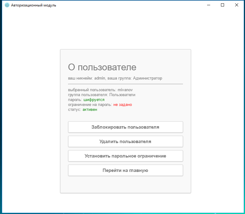 - В режиме администратора программа должна поддерживать следующие функции (при правильном вводе пароля): • смена пароля администратора (при правильном вводе старого пароля); • просмотр списка имен зарегистрированных пользователей и установленных для них параметров (блокировка учетной записи, включение ограничений на выбираемые пароли) – всего списка целиком в одном окне или по одному элементу списка с возможностью перемещения к его началу или концу; • добавление уникального имени нового пользователя к списку с пустым паролем (строкой нулевой длины); • блокирование возможности работы пользователя с заданным именем; • включение или отключение ограничений на выбираемые пользователем пароли (в соответствии с индивидуальным заданием, определяемым номером варианта); • завершение работы с программой.