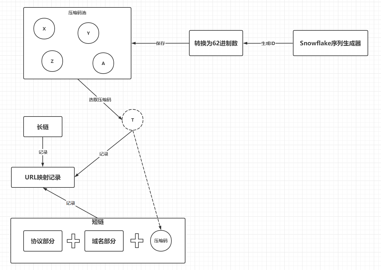 因为运用部门对短链生成的批量不大,而且短链域名只有一个,所以简单起见,一次压缩操作直接消耗掉一个压缩码,不考虑不同短链域名对同一个压缩码进行共享,也不考虑压缩码的回收问题。