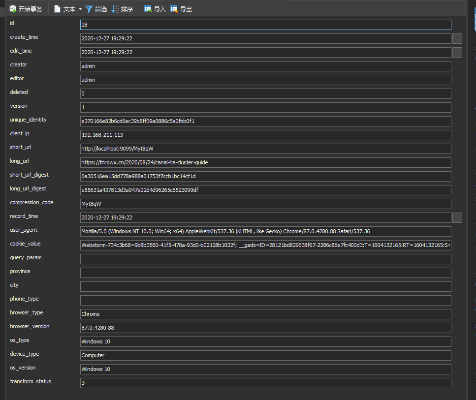 [2020-12-27 19:29:22,285] [INFO] cn.throwx.octopus.server.application.consumer.TransformEventConsumer [org.springframework.amqp.rabbit.RabbitListenerEndpointContainer#0-1] [1c603903-e8d8-4072-aa97-6abf614b9411] - 接收到URL转换事件,内容:{"clientIp":"192.168.211.113","compressionCode":"Myt8qW","userAgent":"Mozilla/5.0 (Windows NT 10.0; Win64; x64) AppleWebKit/537.36 (KHTML, like Gecko) Chrome/87.0.4280.88 Safari/537.36","cookieValue":"Webstorm-734c3b68=9b8b3560-41f5-478a-93d0-b02128b1022f; __gads=ID=28121bd829638f67-2286c86e7fc400d3:T=1604132165:RT=1604132165:S=ALNI_MbsMQROv6swaC8kf4ux2suZm_GZXA; Hm_lvt_4df6907aebab752244c3ca1432b4ff57=1605930058,1607228133","timestamp":1609068562262,"shortUrlString":"http://localhost:9099/Myt8qW","longUrlString":"https://throwx.cn/2020/08/24/canal-ha-cluster-guide","transformStatusValue":3}......